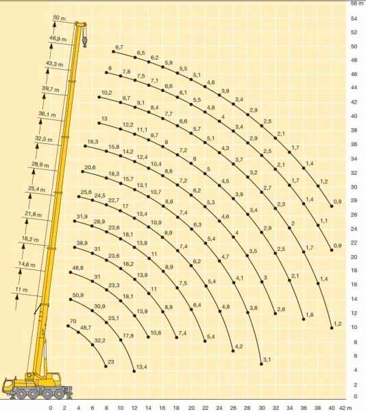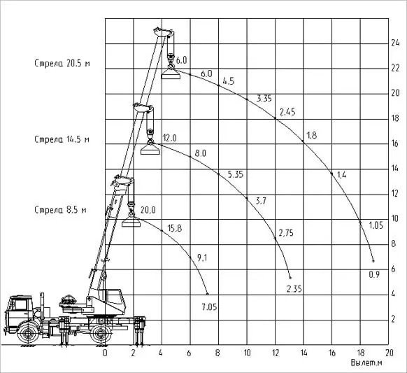 - Расстояние от оси вращения крановой установки до центра монтажа подскажет требуемое соотношение грузоподъемности крана, высоты подъема крюка, вылета стрелы и веса груза. Характеристики каждой модели автокрана позволяют не ошибиться при выборе.